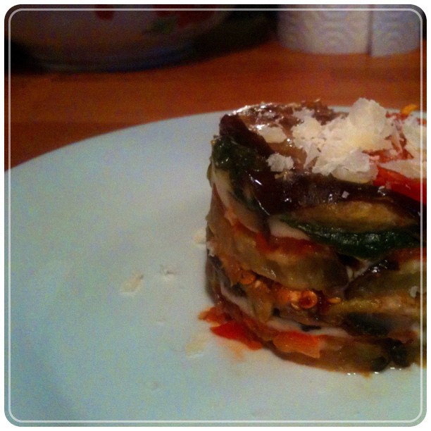 Oven roasted some eggplant slices in olive oil, s and p - sauteed mushrooms and spinach, sliced a tomato thinly, layered the entire thing all pretty with cheese in between for a pretty terrine. baked, weighed it down, chilled and cut out rounds, stacking 2 on each other. heated it up and topped w parmy. Good cold, too.